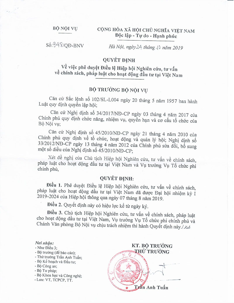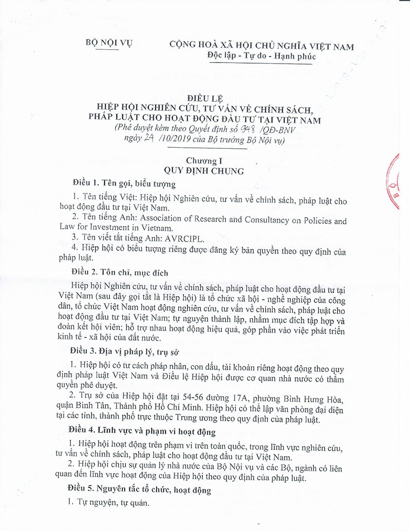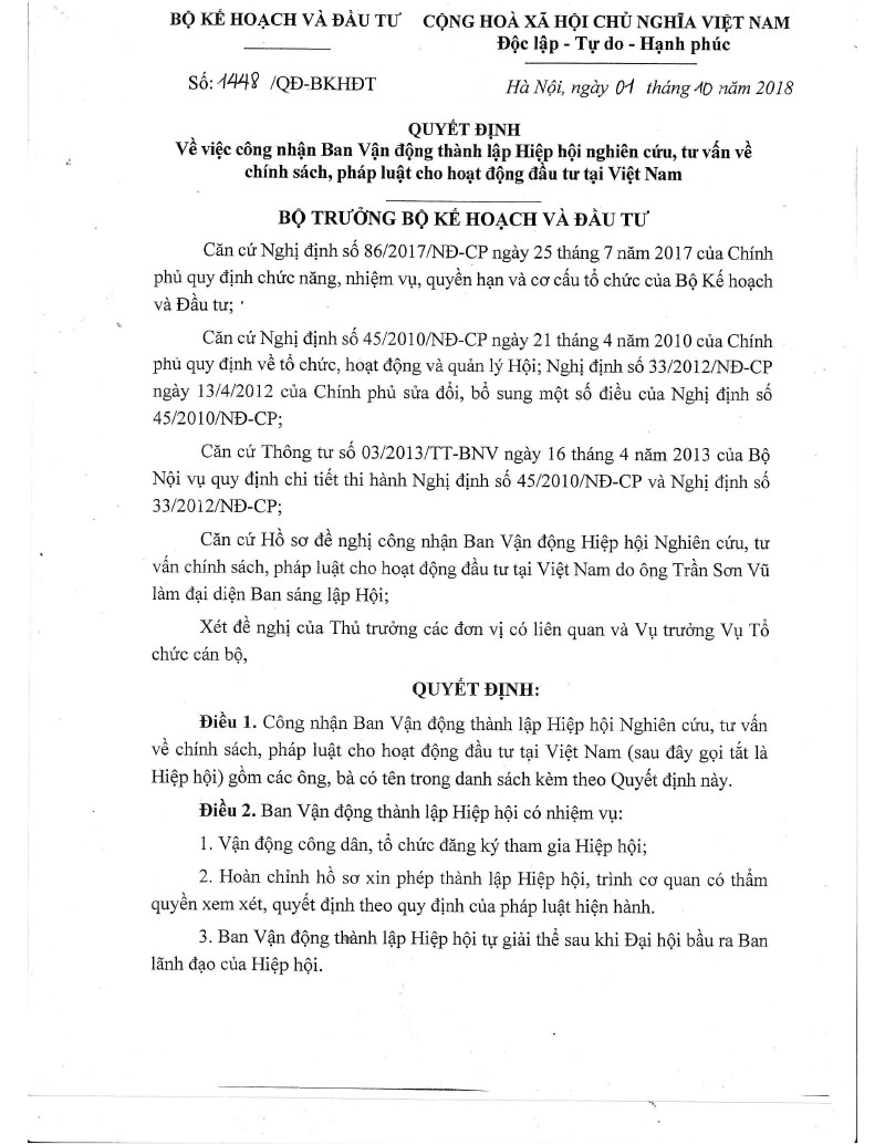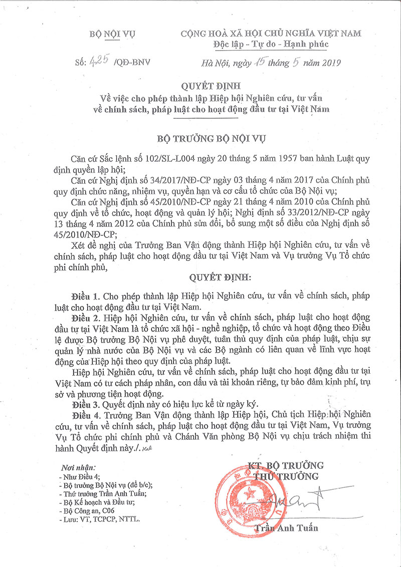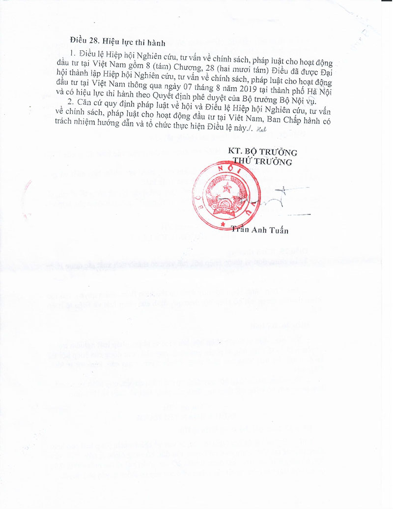 HIỆP HỘI NGHIÊN CỨU, TƯ VẤN VỀ CHÍNH SÁCH, PHÁP LUẬT CHO HOẠT ĐỘNG ĐẦU TƯ TẠI VIỆT NAM